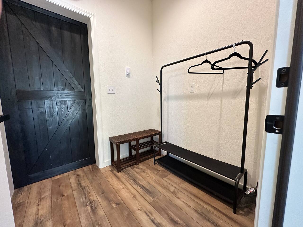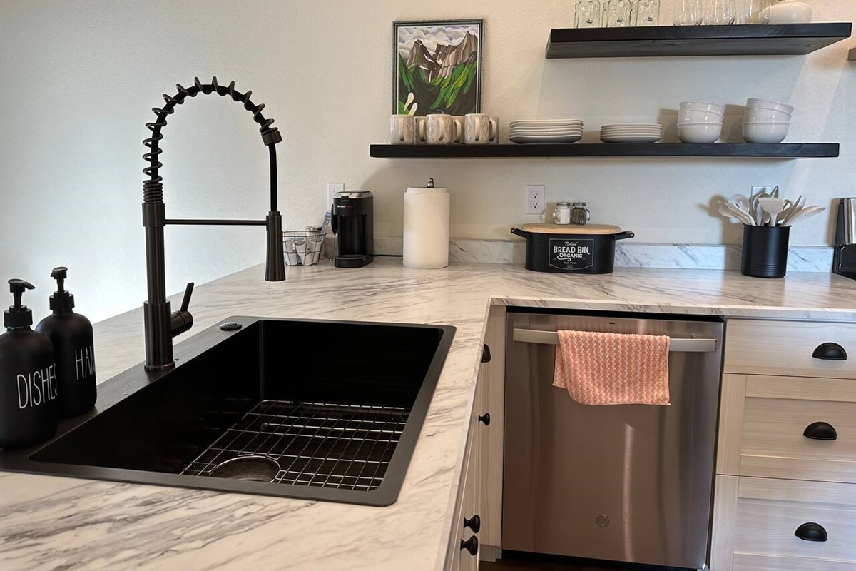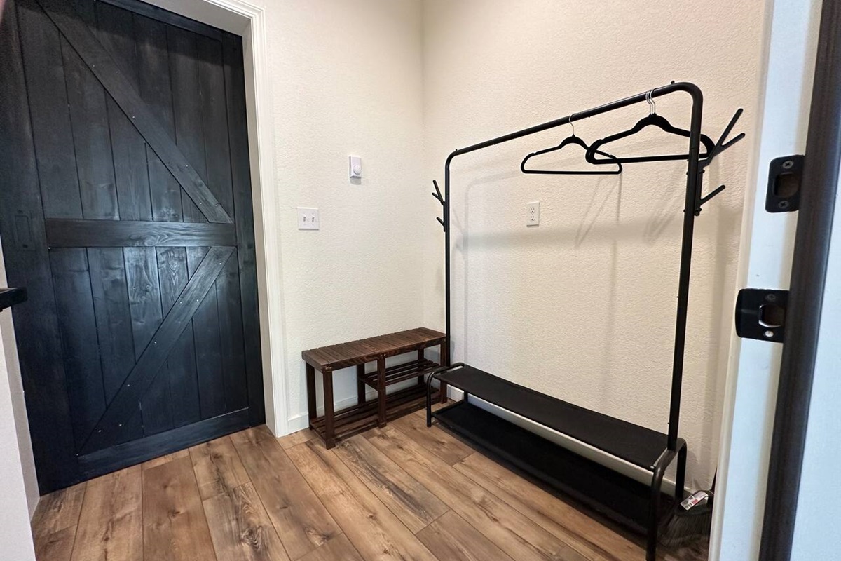 When you arrive at The Stallion’s Stay (Unit A), you will pull in to the back of the home toward the garage. You will enter by keypad on the side door of the garage. Leaving the garage you will enter into the mud/laundry room. Here you can hang your coats or your laundry during laundry days and leverage the bench when taking off your shoes. Provided for you will be laundry detergent and wool balls for the dryer Beyond the barn door is the main living area. It’s an open space that sleek and minimal yet spacious. The center island can expand to be a table for four. Enjoy the popcorn maker (pantry) and coffee & tea station for use. You may also sit at the bar opposite of the sink.